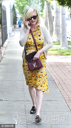 近日,美国影视演员克尔斯滕·邓斯特身穿黄色碎花无袖连衣裙,搭配一款米色针织衫和黑色乐福鞋,现身街头。这款黄色碎花无袖连衣裙可以直接单穿,也可以这样搭配针织外套一起穿,再搭配平底鞋穿十分温柔淑女,给人一种闲适自在的感觉。