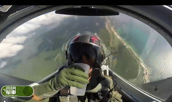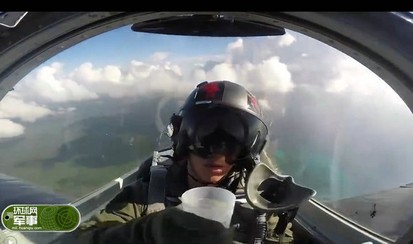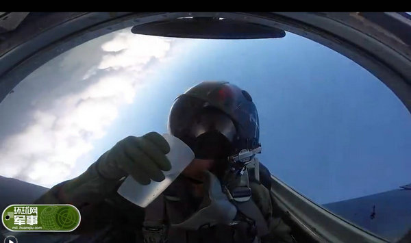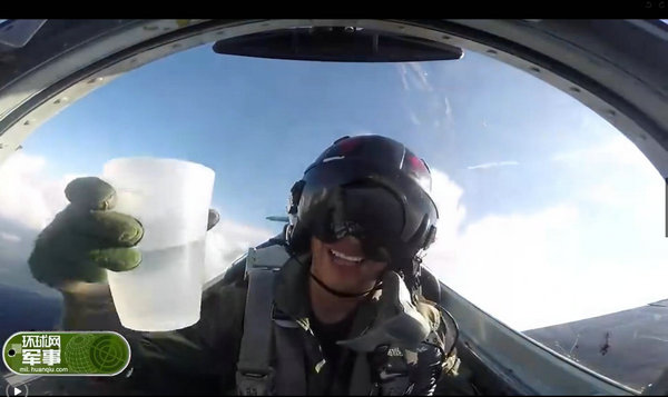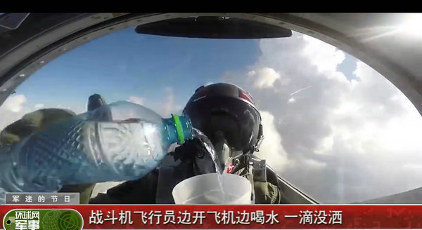 视频截图:飞行员战机中喝水一滴未洒。